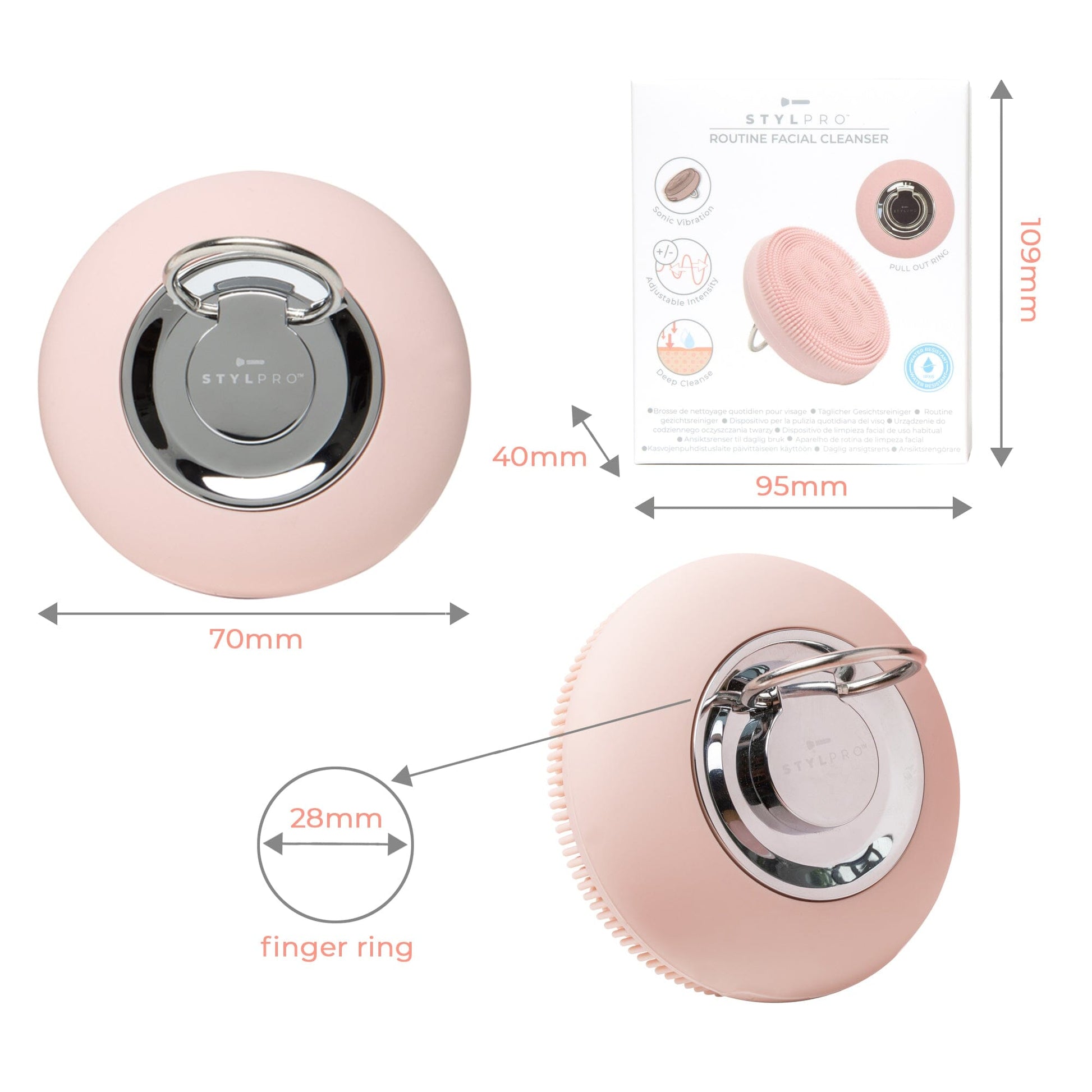 The ring on the back of the STYLPRO Facial Cleansing Device is perfect for ensuring a great grip while holding the device. You can also use the ring to hang up your device when you are not using it!